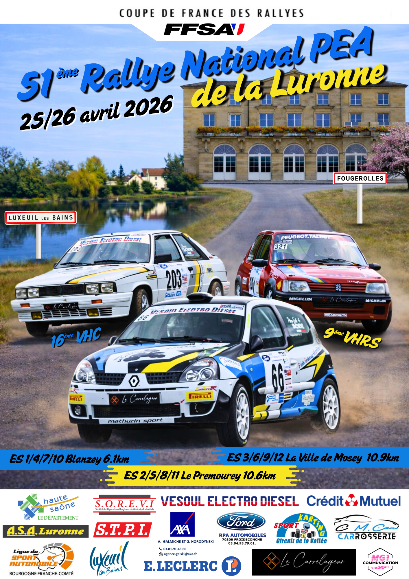 Le 51ème Rallye National PEA de la Luronne compte pour la Coupe de France des Rallyes 2026 Coefficient 3, les challenges de la ligue du sport automobile BFC 2026, les challenges STPI-SOREVI, VED et ASA LURONNE 2026.